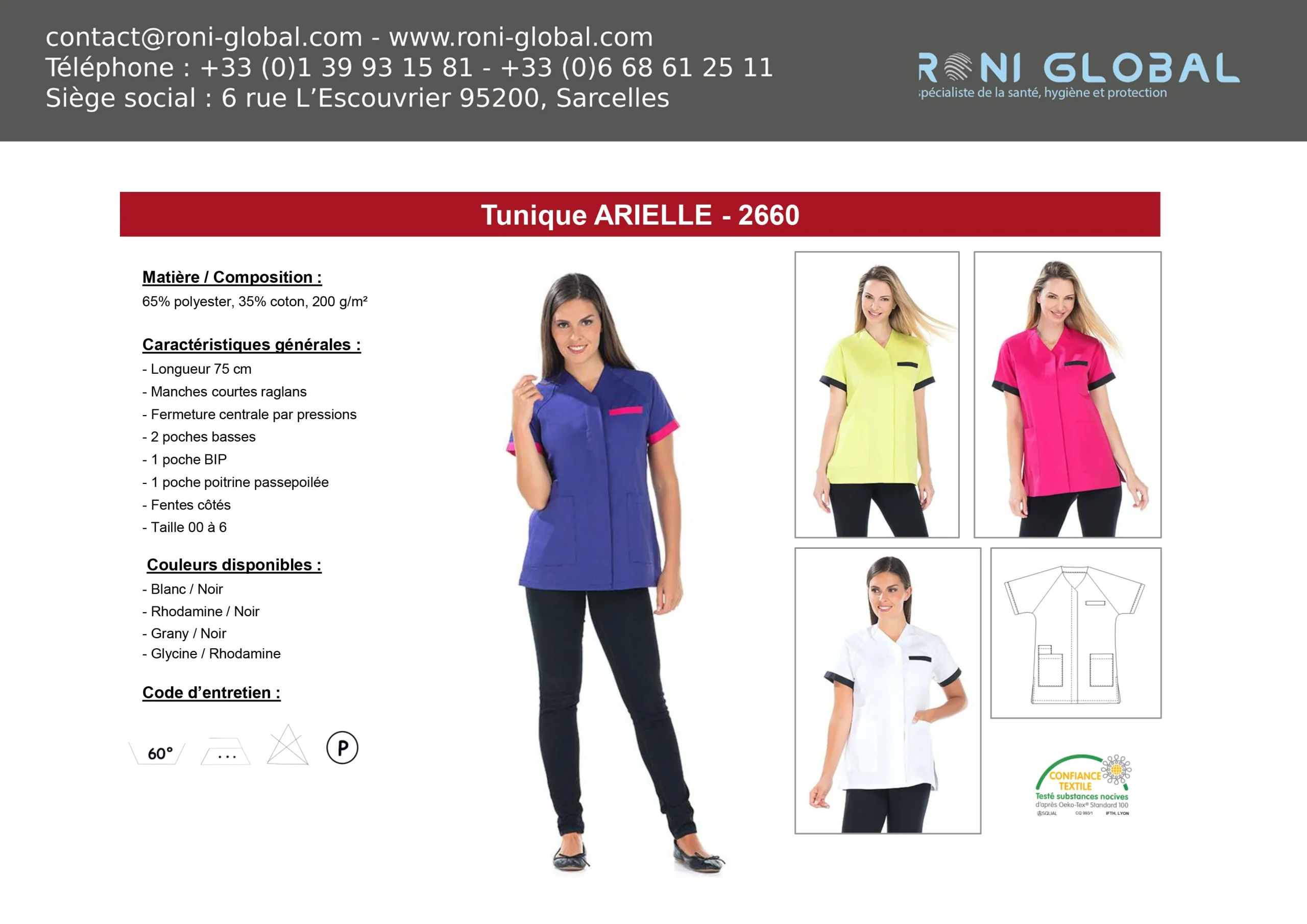 * POUR PLUS D’INFORMATION, CONSULTEZ LA FICHE TECHNIQUE! Les prix peuvent changer selon la couleur, la matière, la taille et le poids. ARIELLE Tunique Ref: R-2660 Tunique manches courtes, emmanchures raglan, fermeture par pressions sous patte, 4 poches, fentes côtés, long.75cm.