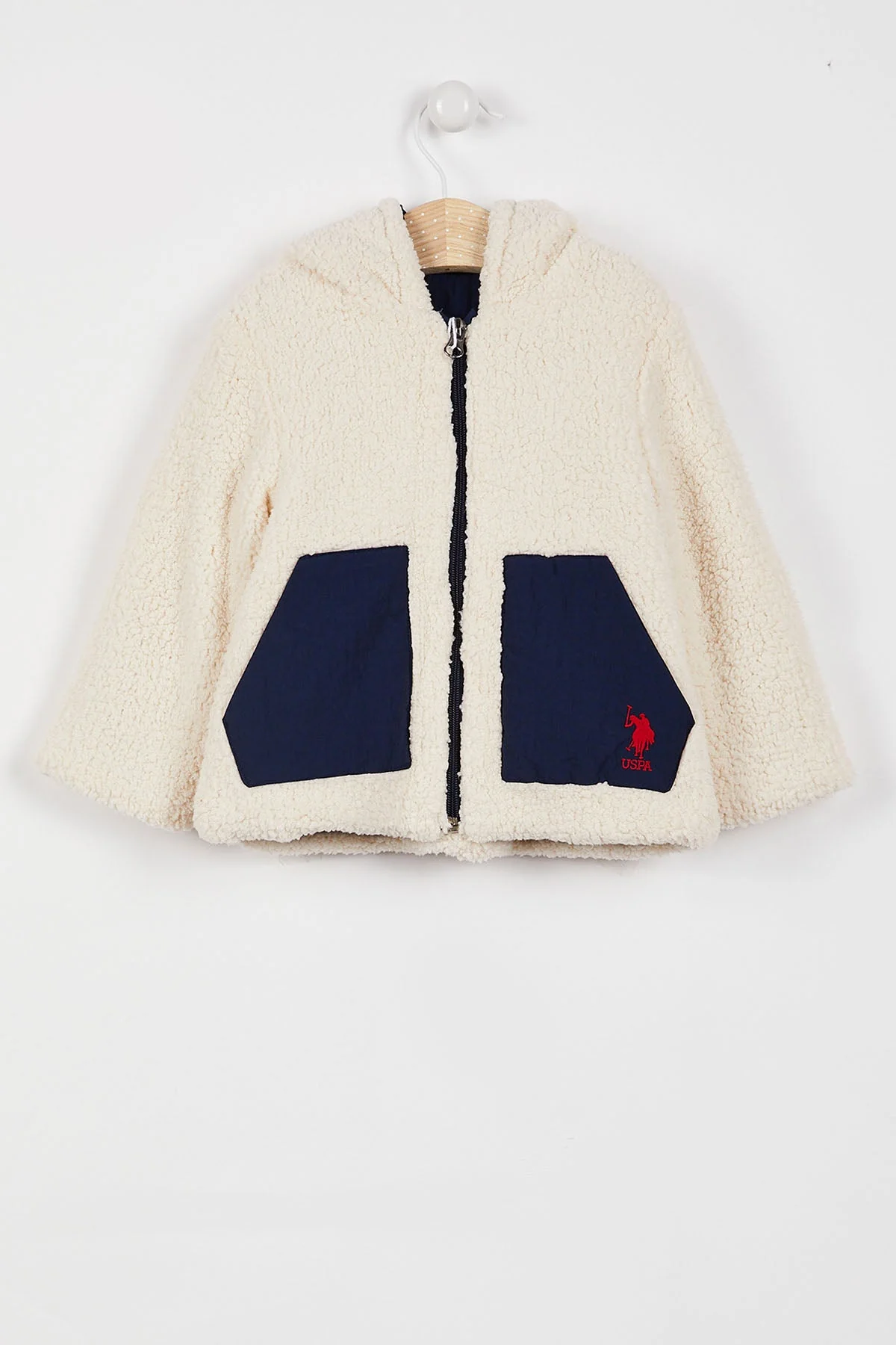 Blouson unisex couleur crème bleu marine effet mouton à  capuche et manches longues, double face. Fermeture zip sur le devant. Poches avant. Décor USPA sur le bas de la poche gauche.