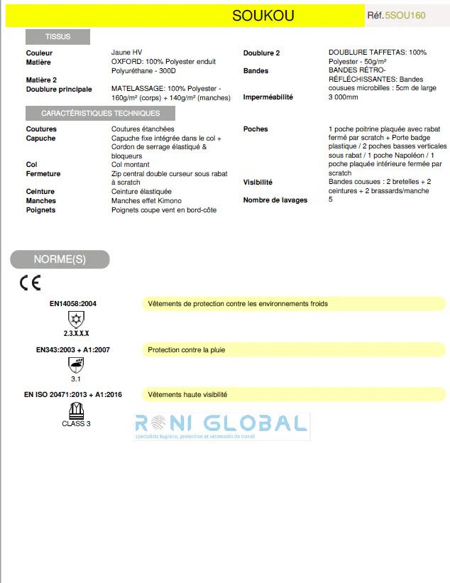 Oxford : 100% polyester enduit Polyuréthane. 300D Taffetas : 100% polyester. 50g/m2 Matelassage : 100% polyester. 160 g/m2 (corps) + 140 g/m2 (manches) Bandes rétro-réfléchissantes : bandes cousues mcirobilles : 5 cm de large Imperméabilité : 3 000 mm Coutures étanchées, capuche fixe intégrée dans le col + Cordon de serrage élastiqué & bloqueurs, col montant, zip central double curseur sous rabat à scratch 1 poche poitrine plaquée avec rabat fermé par scratch + Porte badge plastique, 2 poches basses verticales sous rabat, 1 poche Napoléon 1 poche plaquée intérieure fermée par scratch Manches effet Kimono, poignets coupe vent en bord-côte, ceinture élastiquée, bandes: double bretelle + double brassard + double ceinture