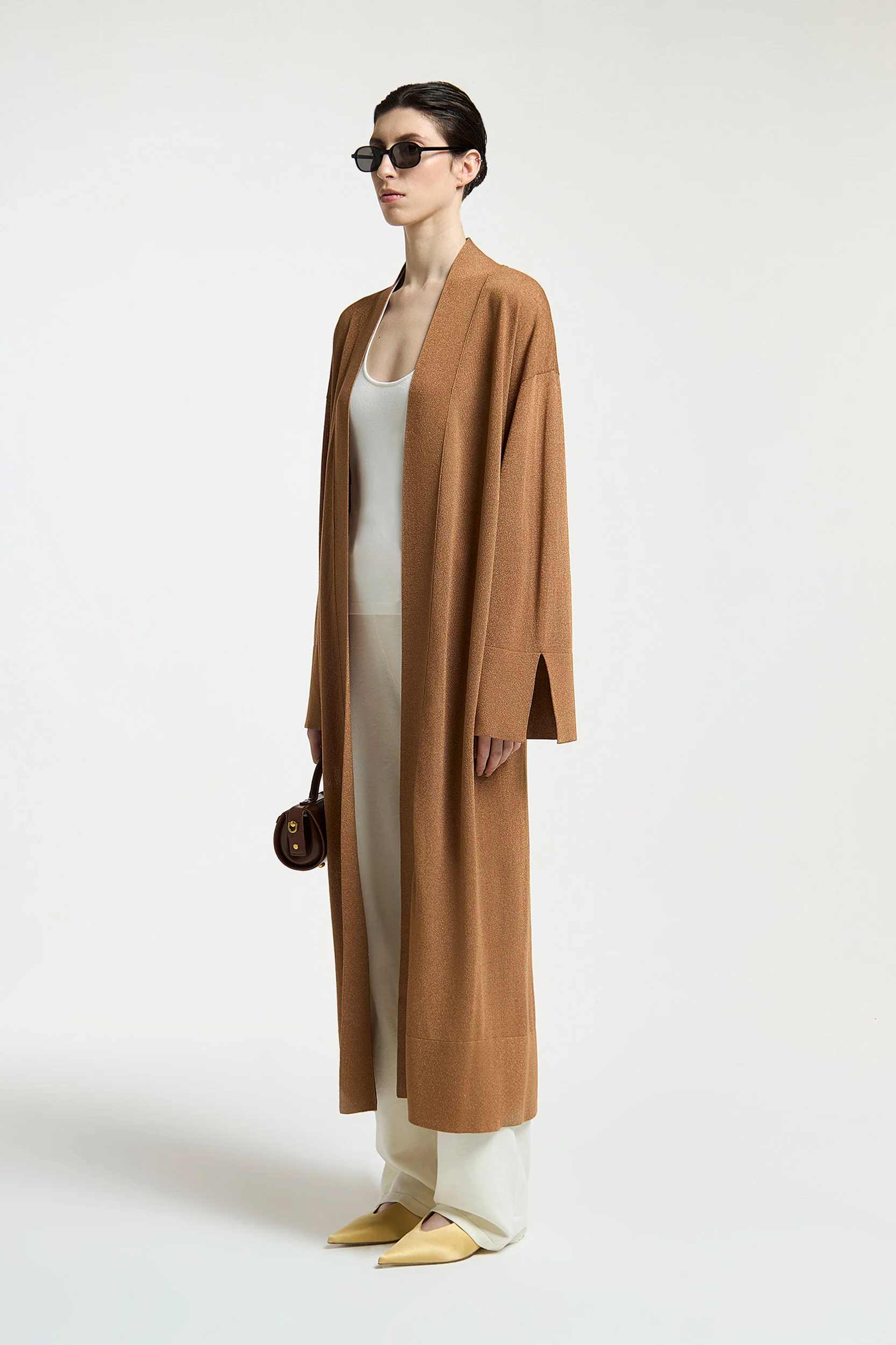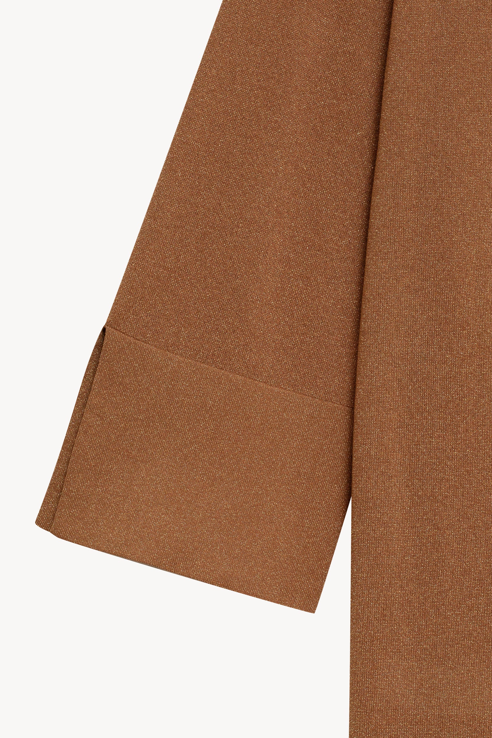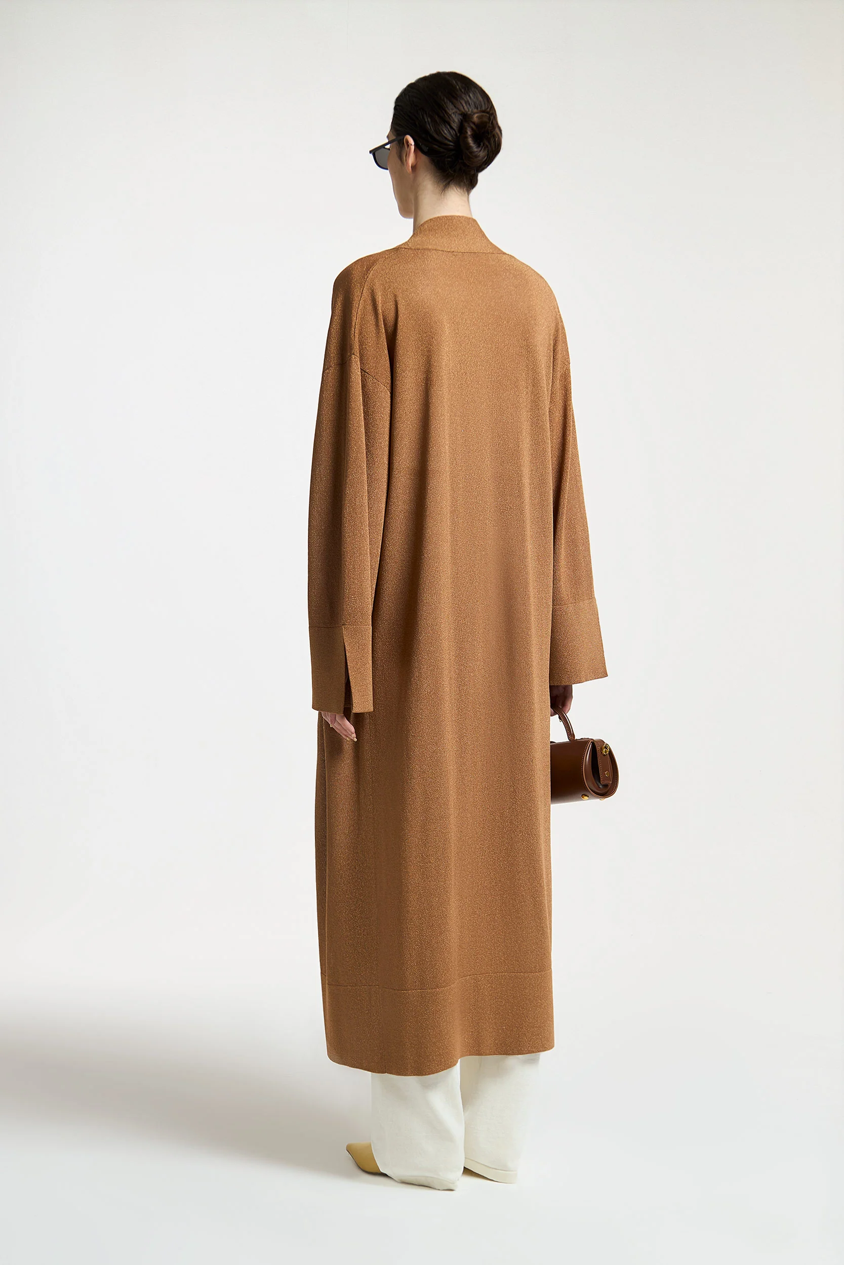Un cardigan qui comprend l’art de la luminosité discrète. Sa coupe ample longueur mi-cuisse et ses épaules tombantes créent une silhouette décontractée-chic, tandis que les fils métallisés (10%) ajoutent des reflets dorés à ce beige sophistiqué. Le col en V et les poignets fendus en font une pièce versatile – à porter sur une robe en soie pour le dîner ou avec un jean blanc pour un déjeuner estival.