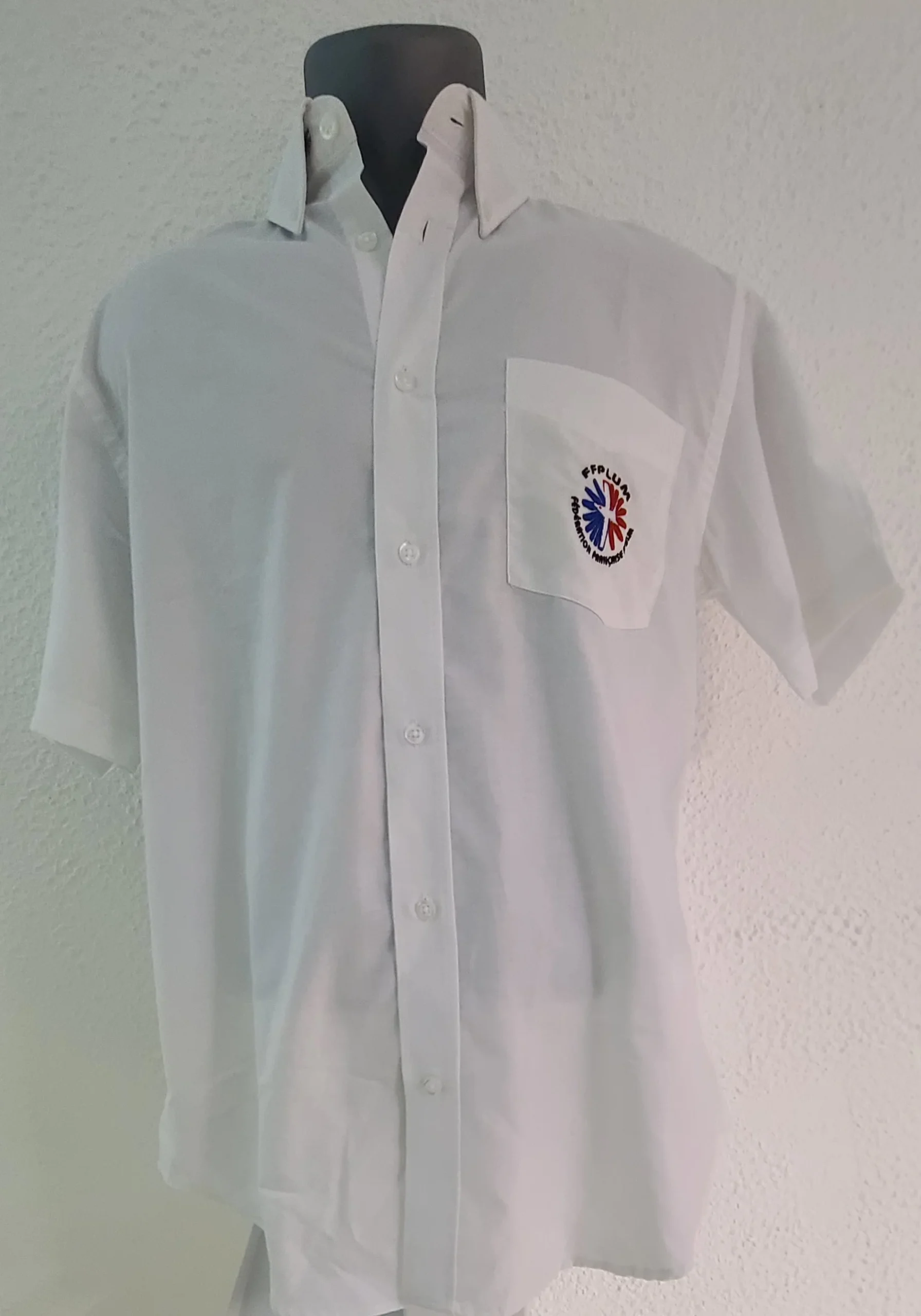 Manches courtesCol à 2 boutonsPatte 7 boutons ton sur tonPoche côté cœur avec logo FFPLUM 5cm2 plis côté au dos 70% coton – 30% polyester