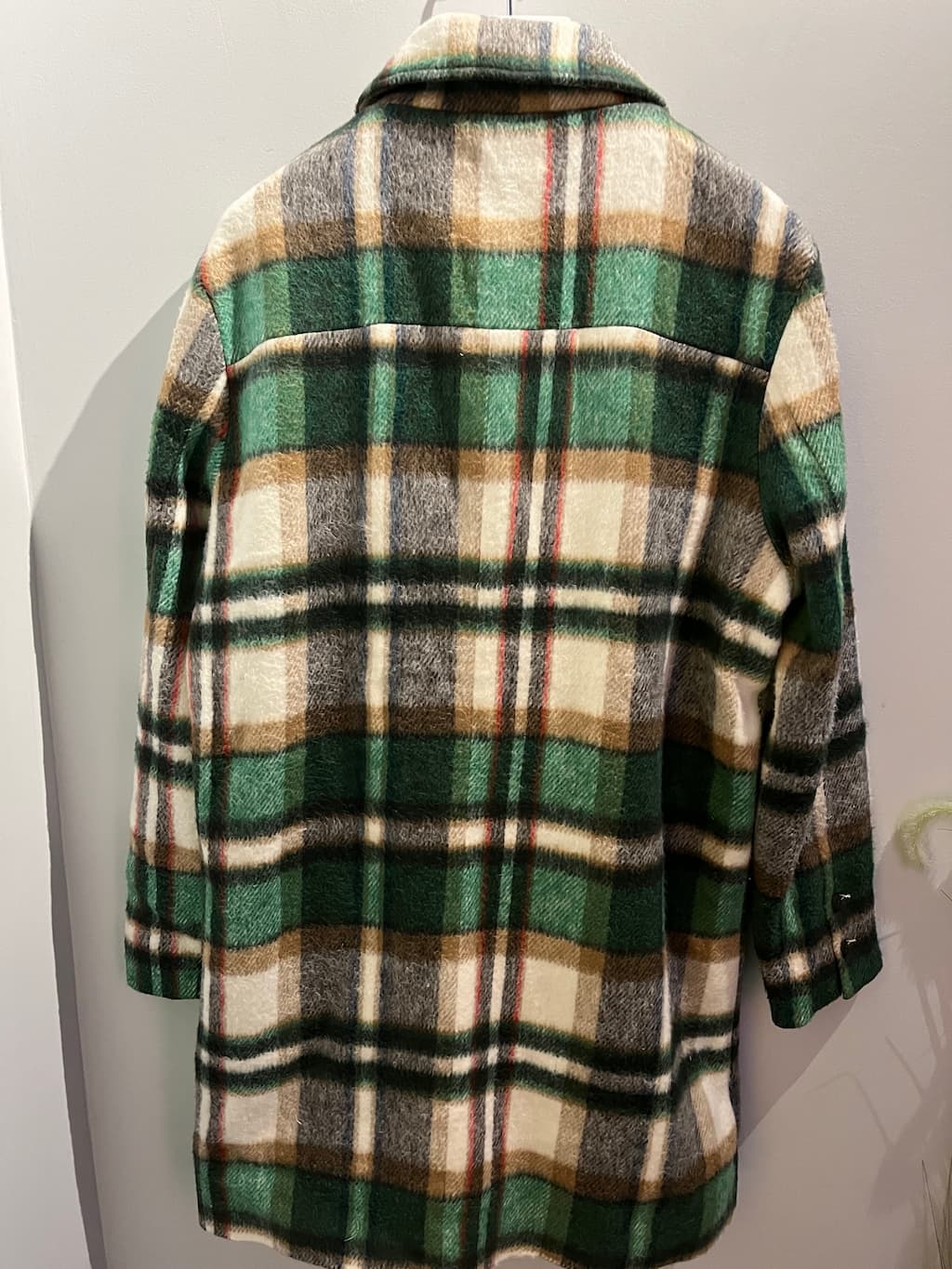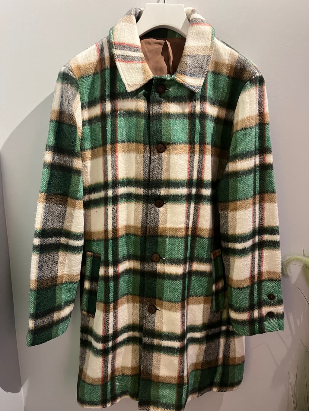 Manteau en laine carreaux Avec deux poches extérieures et deux poches intérieures.