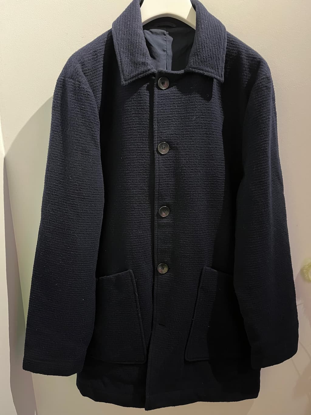 Manteau en laine marine Avec deux poches extérieures et deux poches intérieures.