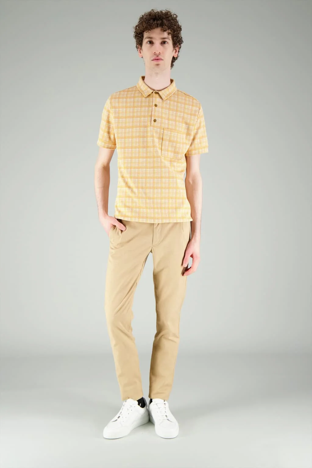 Polo en coton pima japonais à carreaux oranges Col chemise, manches courtes, coupe ajustée. Ce polo est proposé dans un tissu « éco friendly » de grande qualité japonaise.