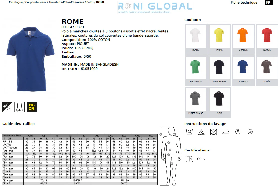 Polo de travail homme manches courtes, coupe droite en coton – ROME PAYPER Ref: pay-001147-0373 Polo à manches courtes à 3 boutons assortis effet nacré, fentes latérales, coutures du col couvertes d’une bande assortie. Composition: 100% COTON Aspect: PIQUET Poids: 185 GR/MQ