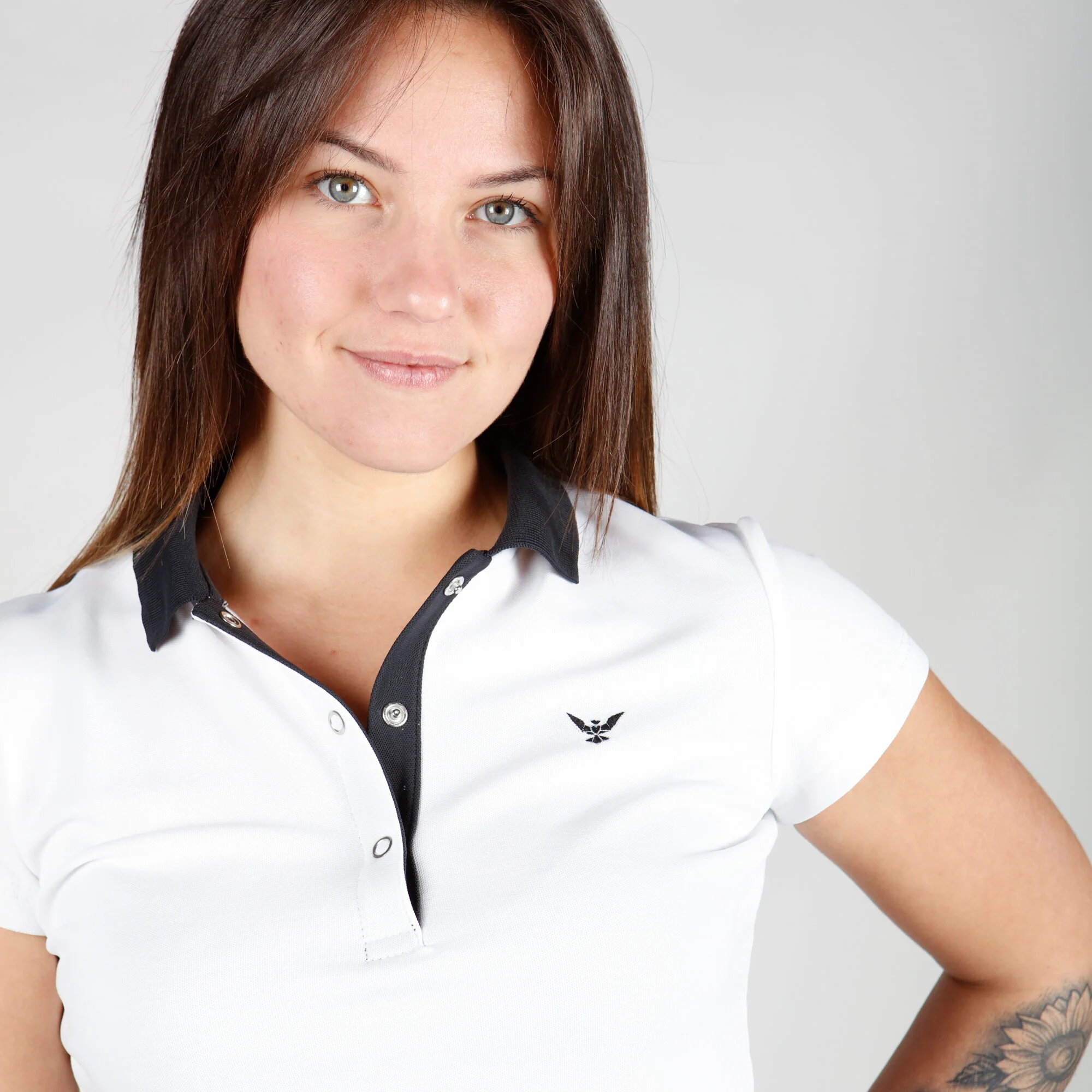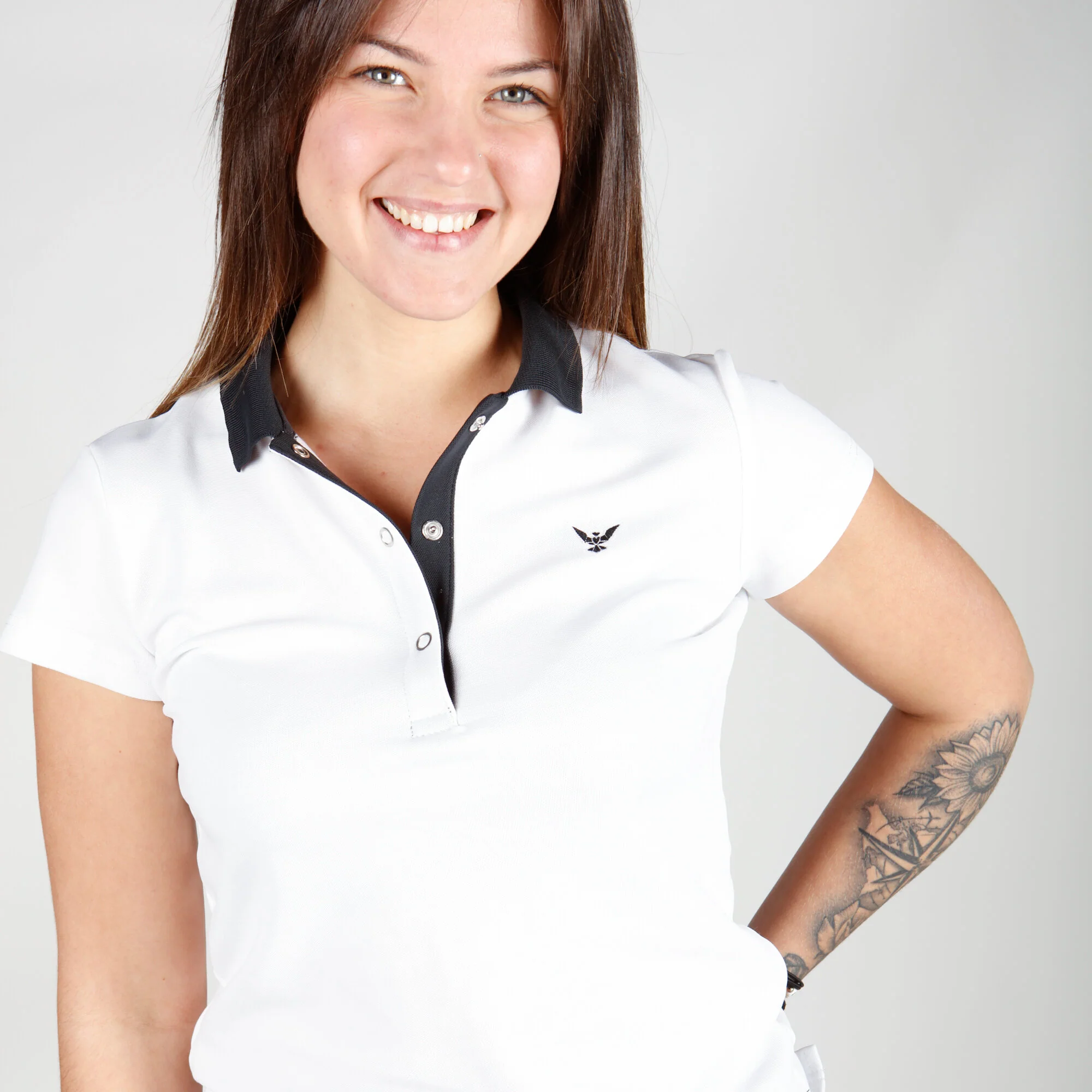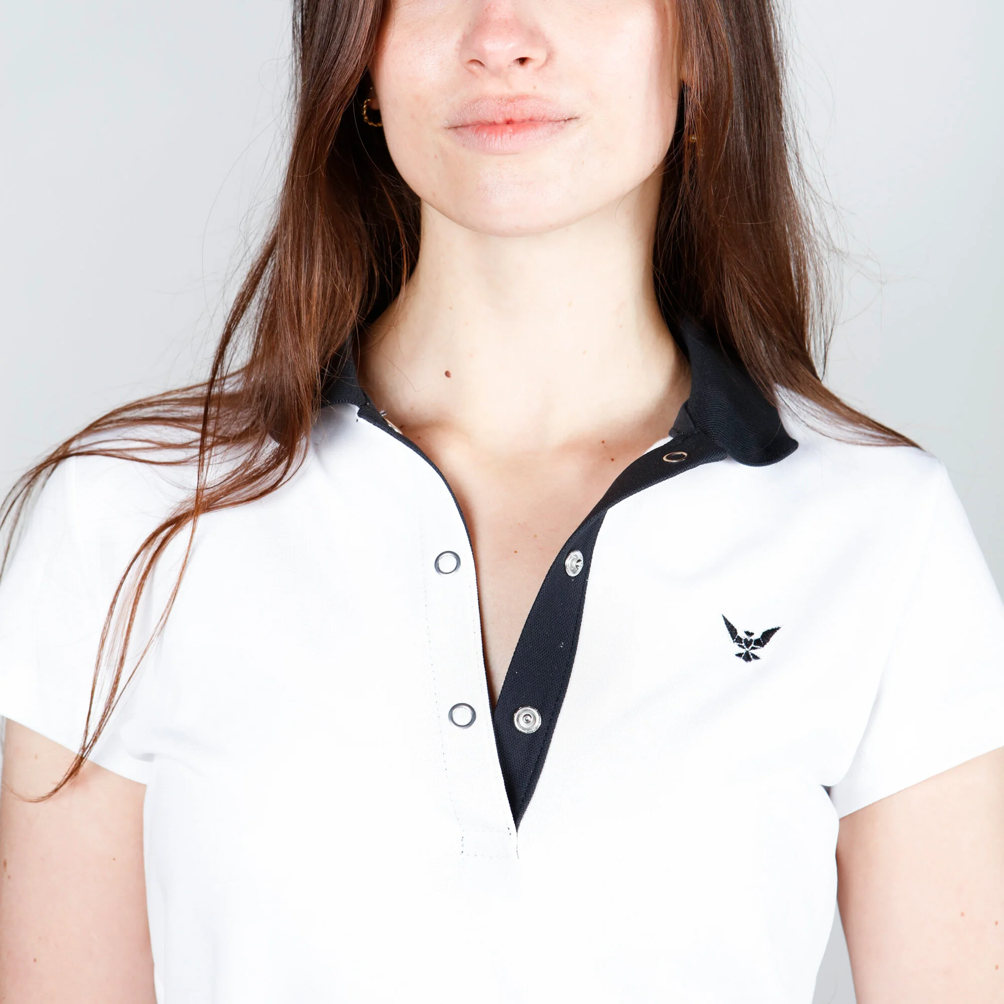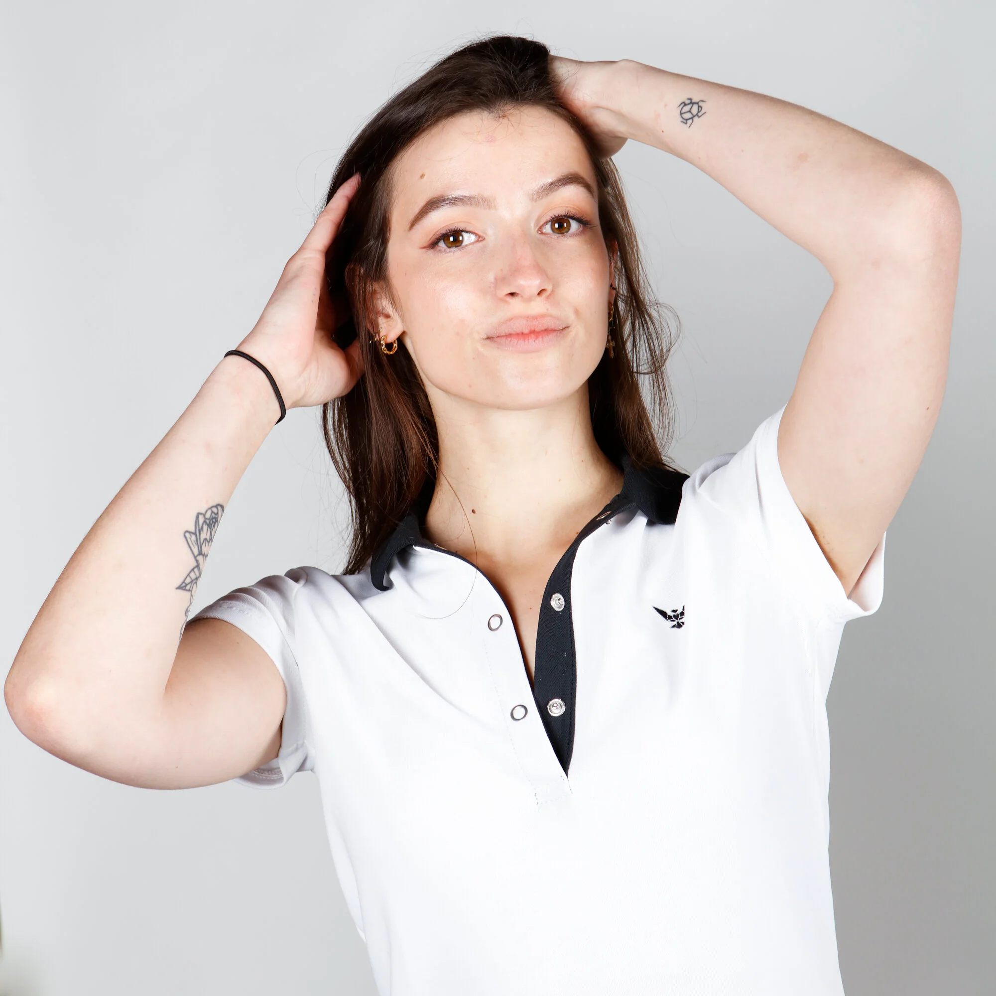Le Polo Fenyx en mode bicolore. Noir et blanc à broderie noire Les filles portent du S