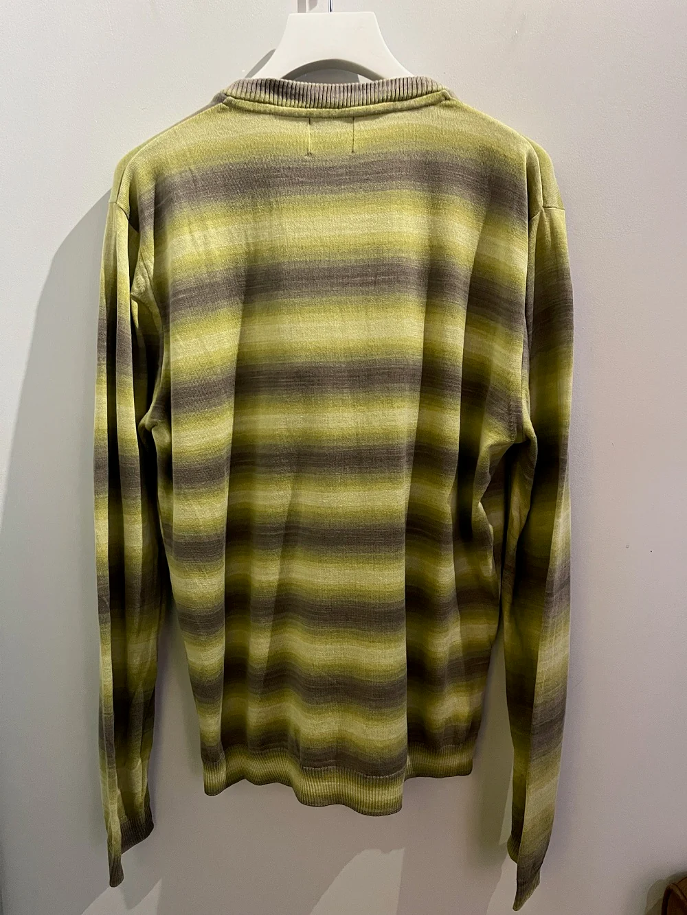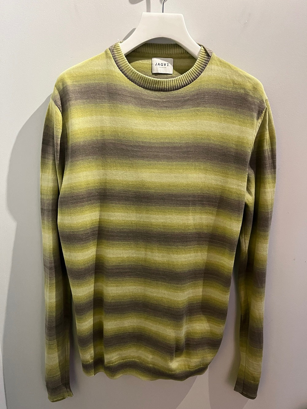 Pull en coton bio japonais A rayures vert anis , avec col rond, manches longues, finitions bord-côtes. Jagvi réalise un pull très léger pour le printemps été dans un coton japonais confortable.
