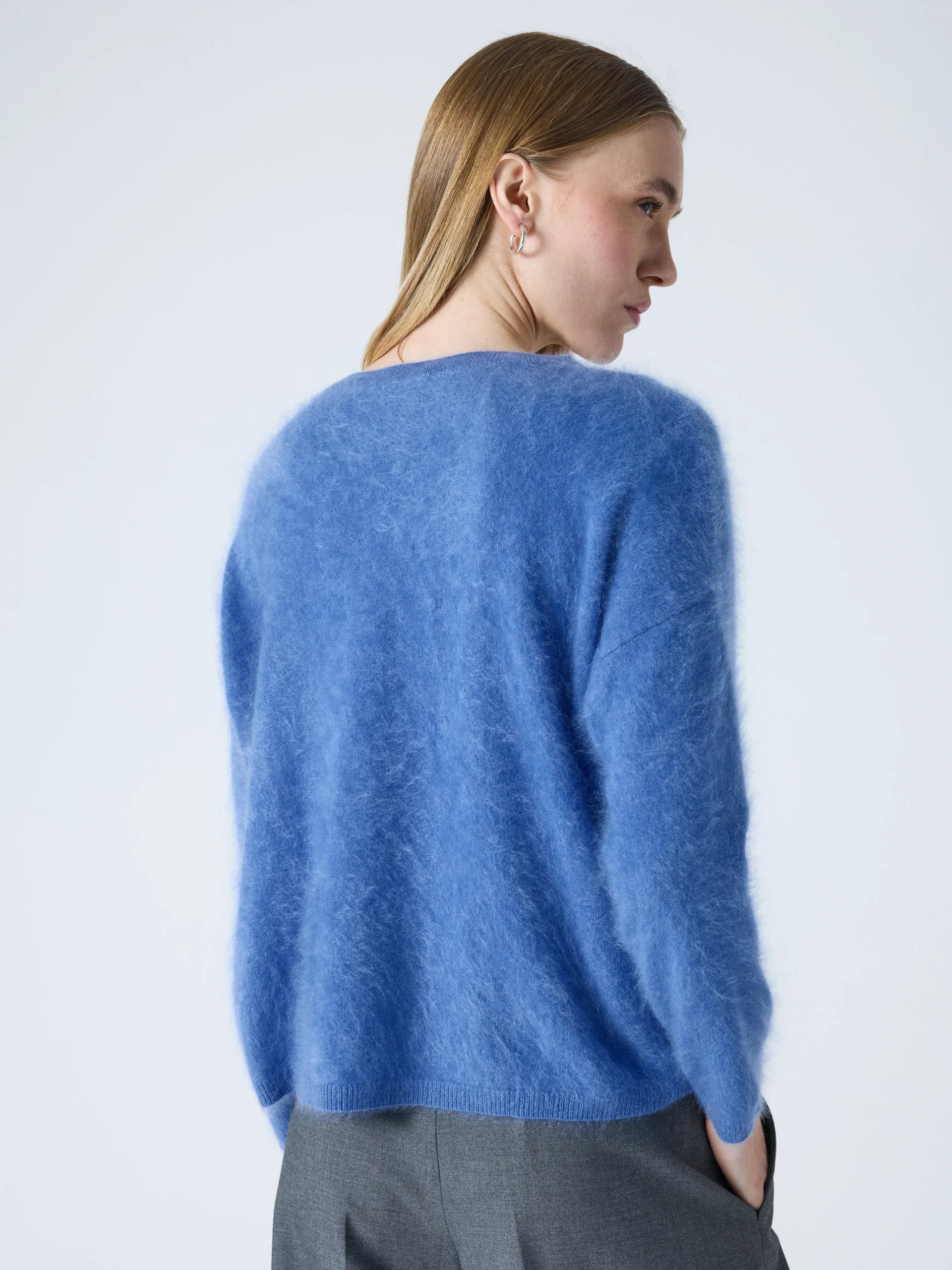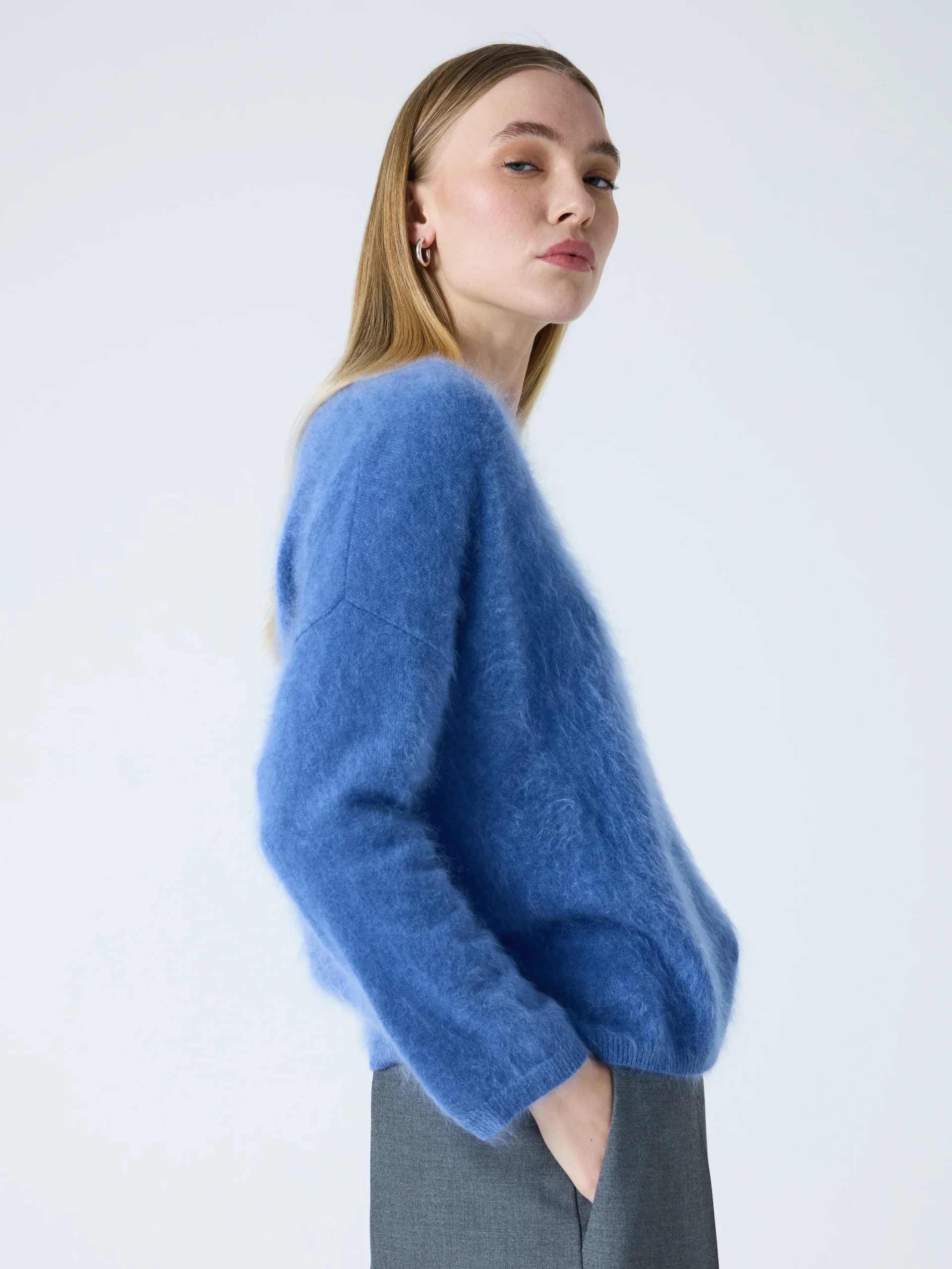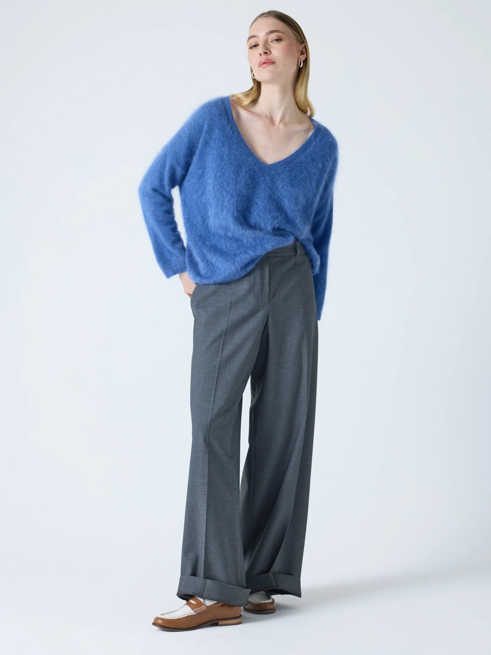 Pull oversize col v en cachemire brossé pour femme. Pull 100% Cachemire Brossé 12 GG Coupe oversize Manches longues côtelés Fentes latérales Finitions bords-côtes Le mannequin mesure 1m77 et porte une taille S. ACF204001C_SOELI_DENIM