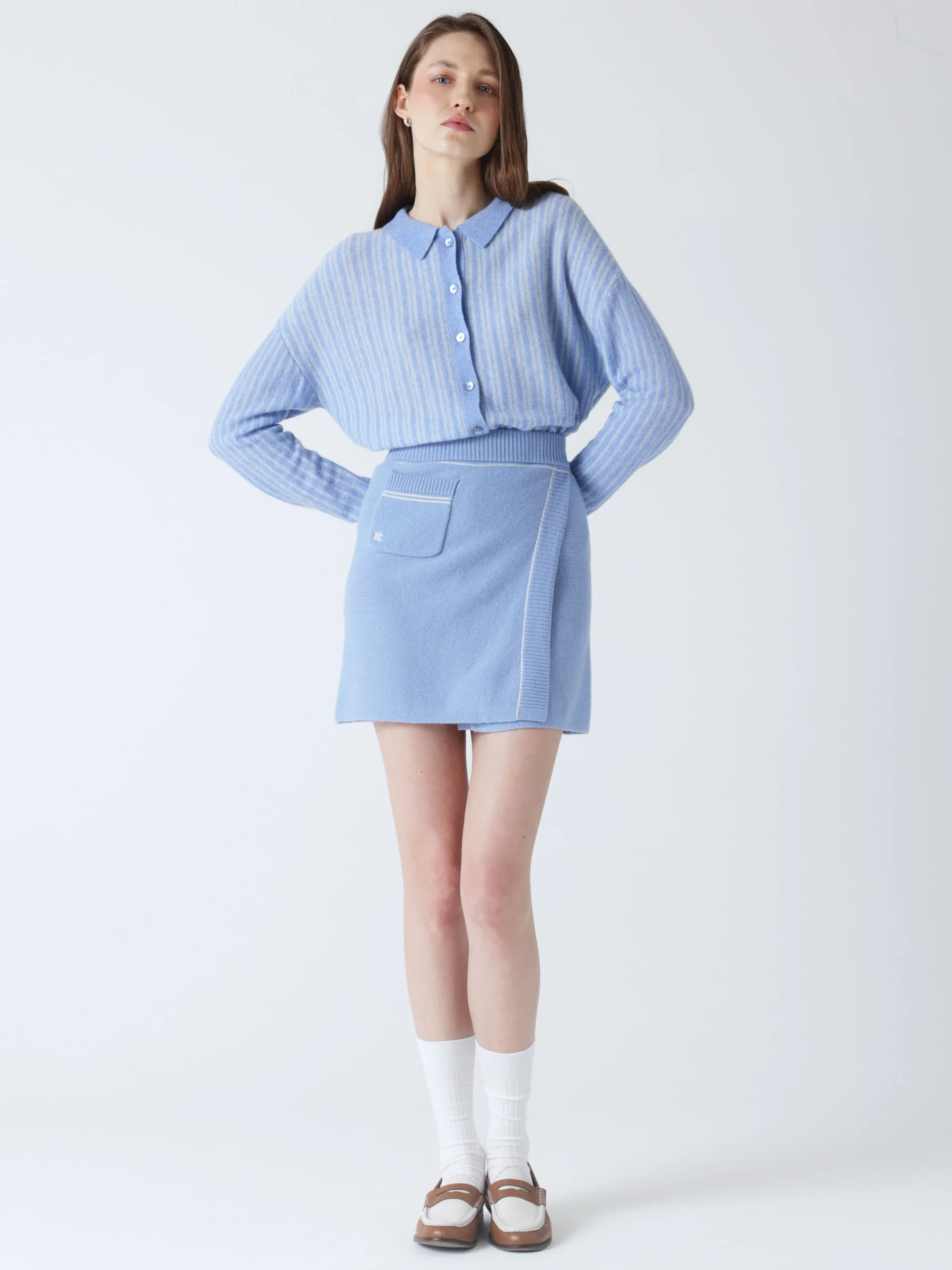 Jupe courte façon porte-feuille pour femme Jupe avec 90% de laine et 10% de cachemire Coupe Courte Poche plaquée sur le côté droit au porté Le mannequin mesure 1m77 et porte une taille S. Longueur taille S : 43 cm. Ajoutez 2 centimètres supplémentaires par taille. Ce modèle a une coupe droite. ACF206301WC_STELLA_SKY