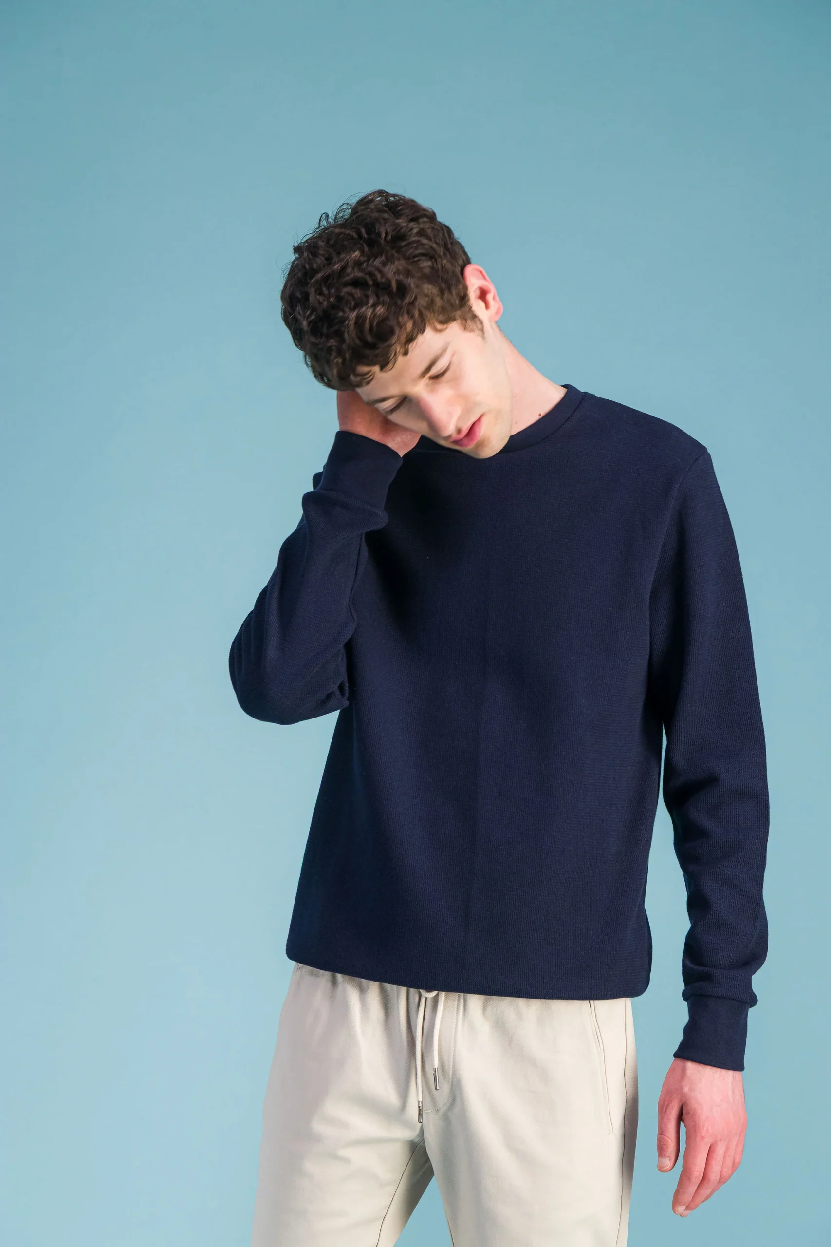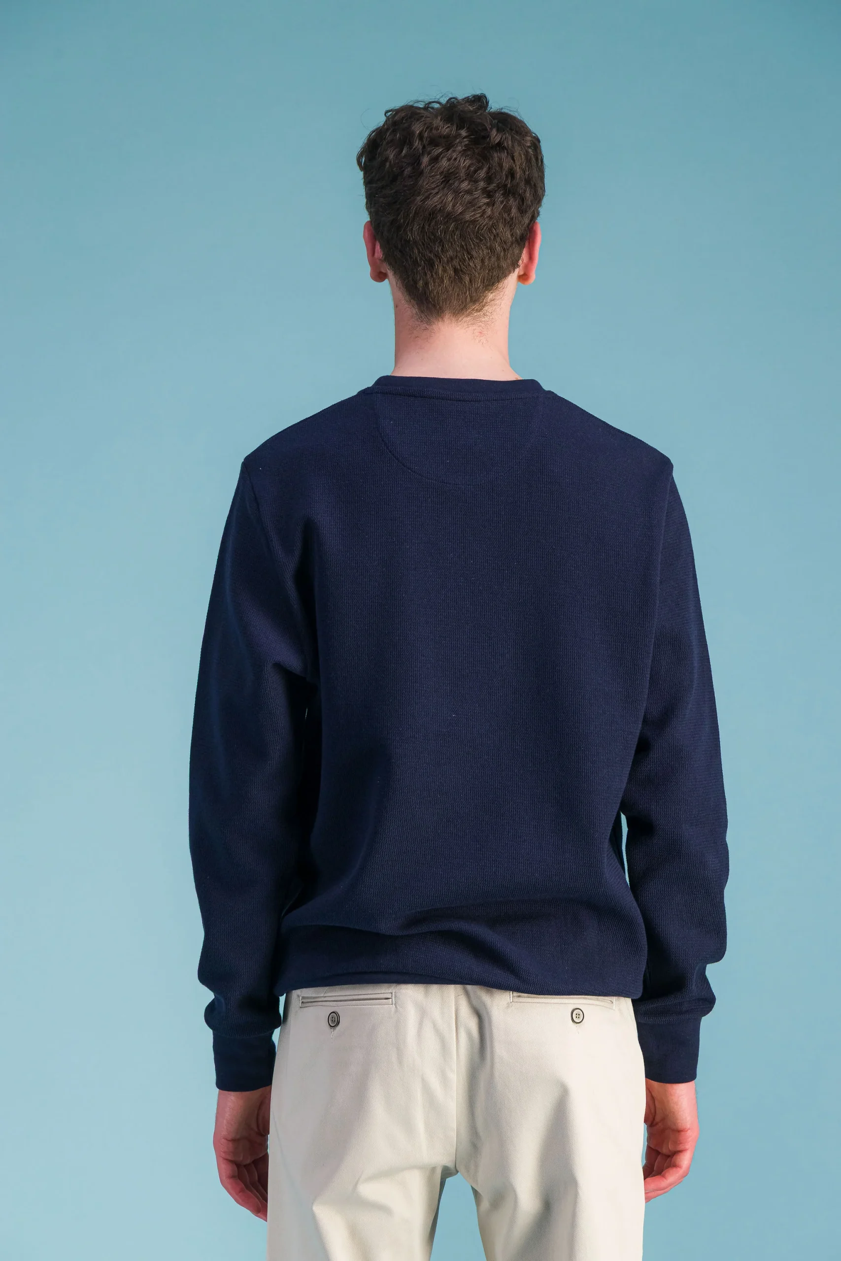 Sweat col rond Couleur marine, manches longues, coupe ajustée, en coton japonais organique nid d’abeille .